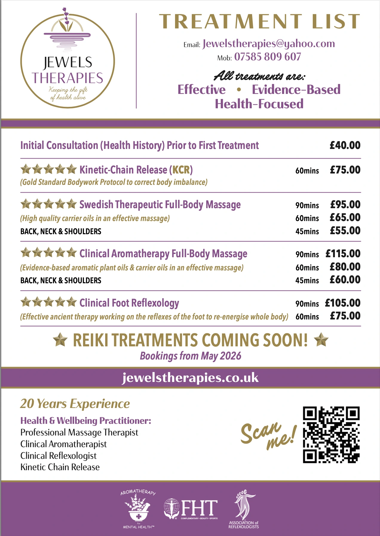 My name is Jewels Victor-Moore (MA, BA, Dip, FHT, AoR). I am a fully qualified and insured health & wellbeing practitioner with 20 years experience. I offer massage therapy including reflexology, aromatherapy and kinetic chain release. Based in Inverness (capital of the highlands) on the NC500, my practice is very accessible. My business values are: